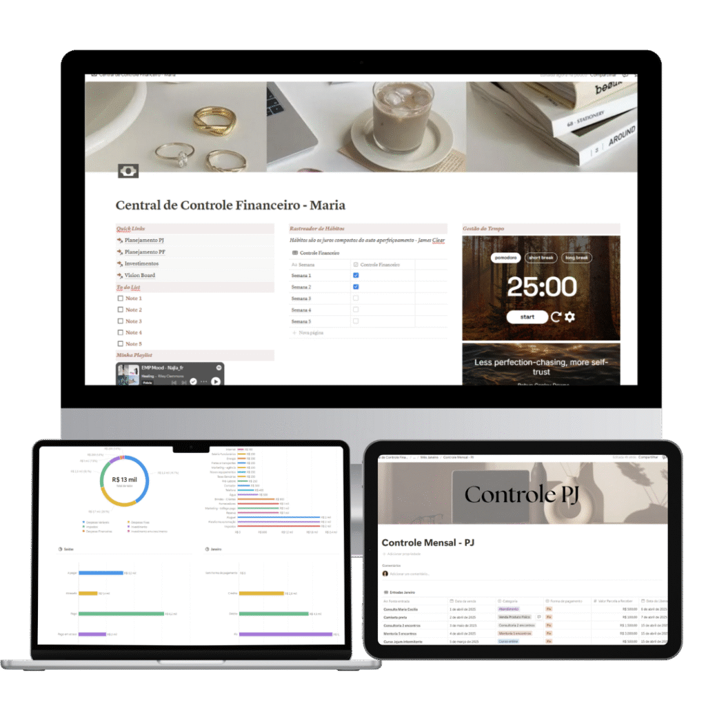 A Central do Notion é um espaço lindo e organizado para você cuidar das suas finanças — sem precisar usar planilhas.